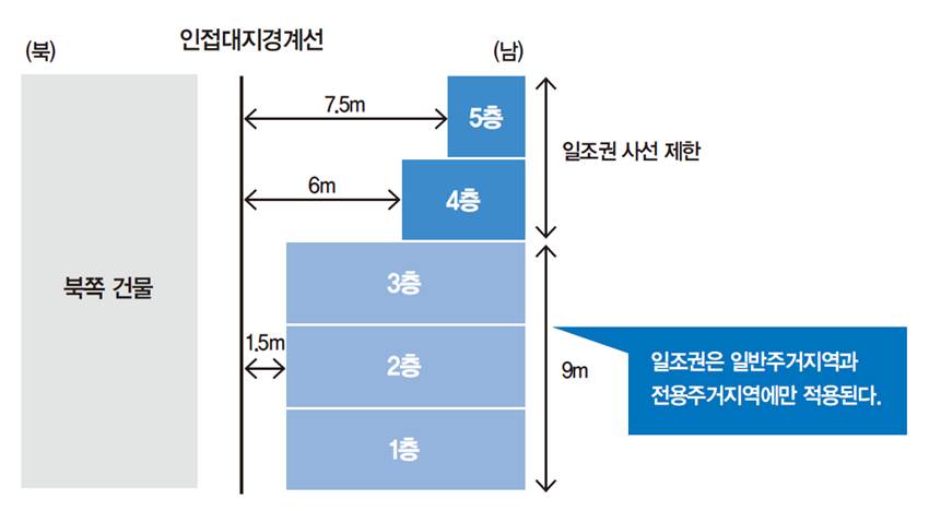 일조권은 주거공간의 일조량에 대한 권리입니다. 그 권리를 보호해 주기 위해서 남쪽 인접한 건물의 높이를 일정한 기준에 의해 제한하는 것입니다. 그것이 일조권 사선제한입니다.