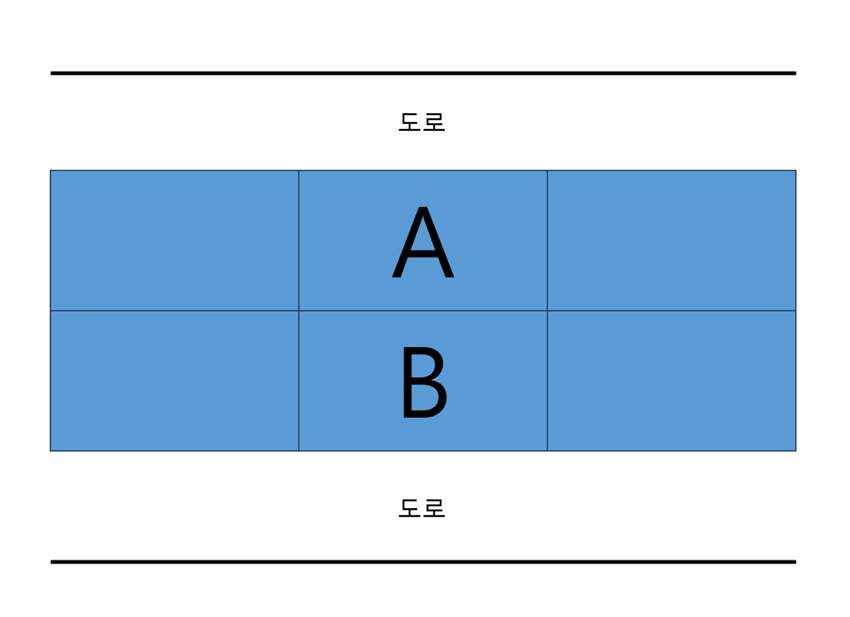 그림과 같이 6필지의 땅이 있습니다. A와 B중에 어떤 땅이 더 좋은 땅일까요? (기타 조건은 동일하다고 가정) 남향의 집을 지을 수 있는 B땅을 많이 선호하십니다. 하지만 일조권 사선제한 측면에서는 A땅이 유리합니다.