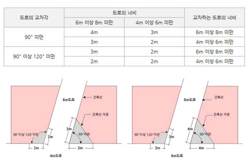 1. 교차각 90°이상이면 2m(교차 도로가 둘 다 6m이상이면 3m)