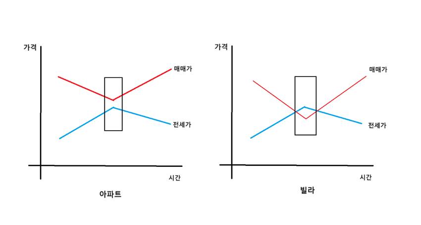 위의 그래프처럼 아파트는 매매가가 하락해도 전세가 보다 역전되기는 어렵습니다. 하지만 빌라는 매매가가 전세가가보다 낮은 시기가 어렵지 않게 발견됩니다. 그만큼 빌라 사장은 불안한 요소가 있습니다.